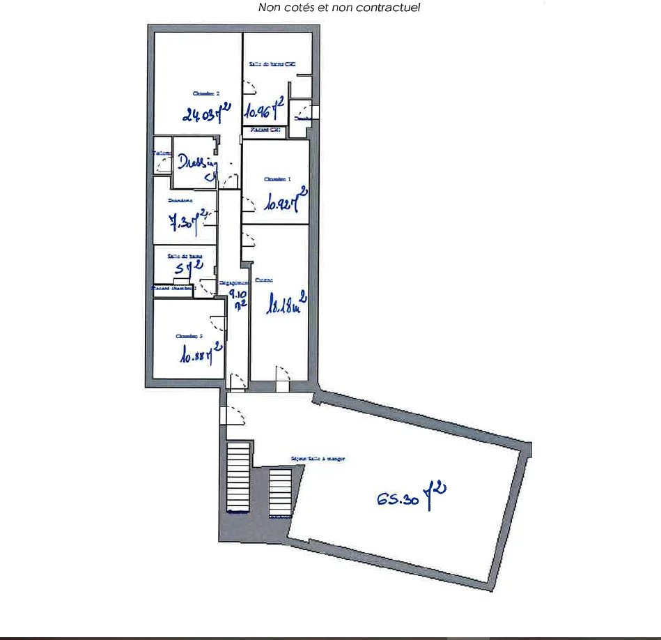 Ground floor: A 65.30m² living room, an 18m² kitchen, three large bedrooms, a dressing room, two bathrooms, a laundry room and two toilets.