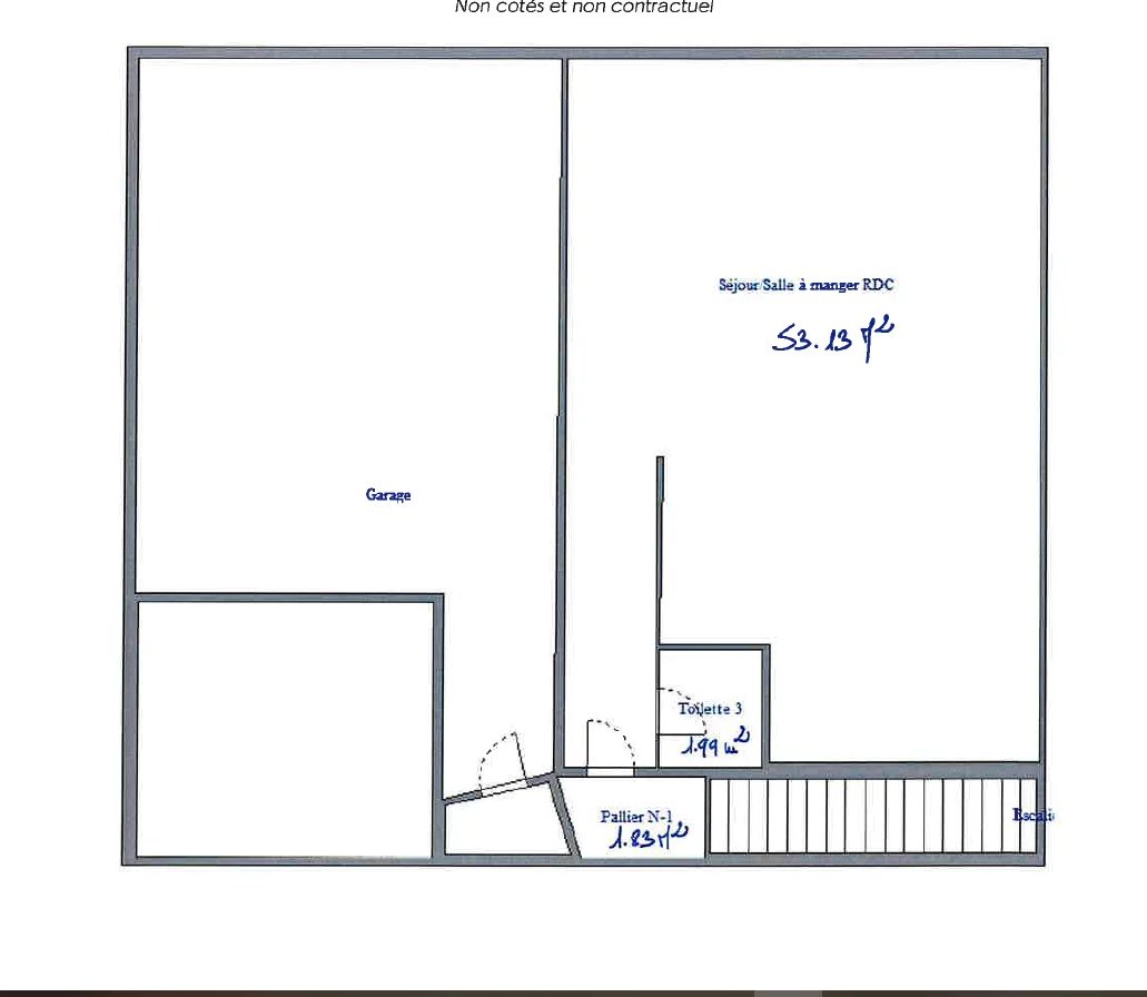 Garden level: a large 53.13m² independent studio-style living room, a toilet, a storeroom and a garage.